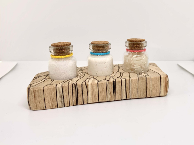 Chaque ingrédient est dans un petit pot en verre rempli à la main, décoré d’un fil de couleur en coton. Leur socle de bois est sélectionné dans mon environnement pour être découpé, poncé et percé par mes soins.